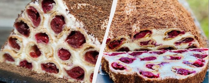 Der köstliche Klosterhüttenkuchen ist eines der „winterlichsten“ Desserts. Er ist nicht nur köstlich, sondern auch ein wunderschönes Dessert, das an verschneites Brennholz erinnert. Die Idee des Gerichts ist ganz einfach: Teigröhren werden mit Kirschen gefüllt, pyramidenförmig übereinander gestapelt und mit saurer Sahne bestrichen. Das fertige Dessert ist süß und sauer, mit einer Beerennote, und sehr leicht für den Magen.